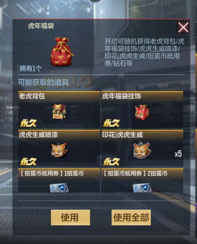 而虎年福袋就很有意思了,里面的道具非常“丰富”,里面有老虎背包、虎年福袋挂饰、虎虎生威喷漆、虎虎生威印花、扭蛋币抵用券、钻石等。但是不得不注意到这几个字:“开启可随机获得”,具体的爆率大家可以在官网查询。