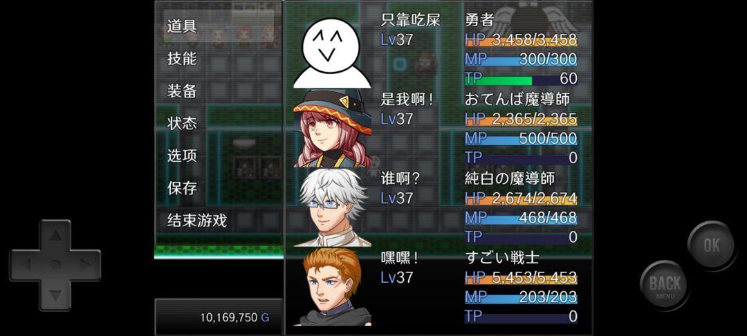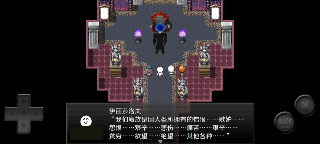 以上阵容打最后魔王不是很轻松,打了有将尽半个小时,建议等级再练高点,我这个等级没有刻意练过,boss一般靠回血复活强化磨过去。输出主要靠主角,女主主要回血以及给主角强化攻击,白毛全程工具人用道具,经测试boss不吃减攻防和毒,群体混乱技能对魔王召唤的三个多边形有效,bug技能没对多边形用不是很清楚。顺带一提步数炸弹的步数不是很清楚怎么算的,扔了一个才打出1000多一点的伤害。黄毛几乎全叠的攻击和血量,偶尔输出,因为耗TP太多了。