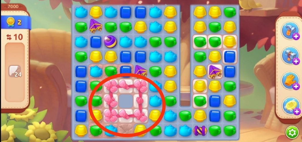 图块掉落后,就可以利用图块来解开这个最后的阻碍元素口字型的蝴蝶结彩带,把最后剩下的方砖收集完成,即可通过此关。