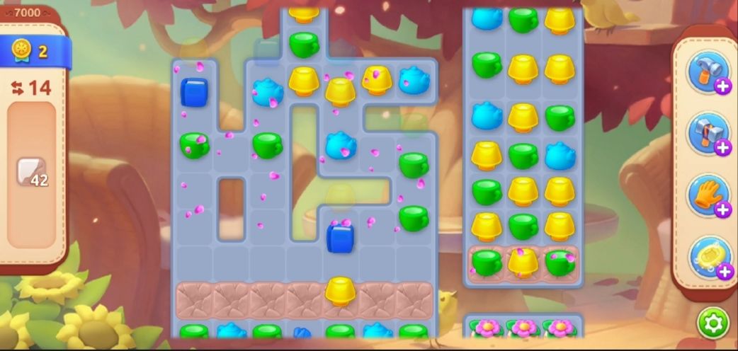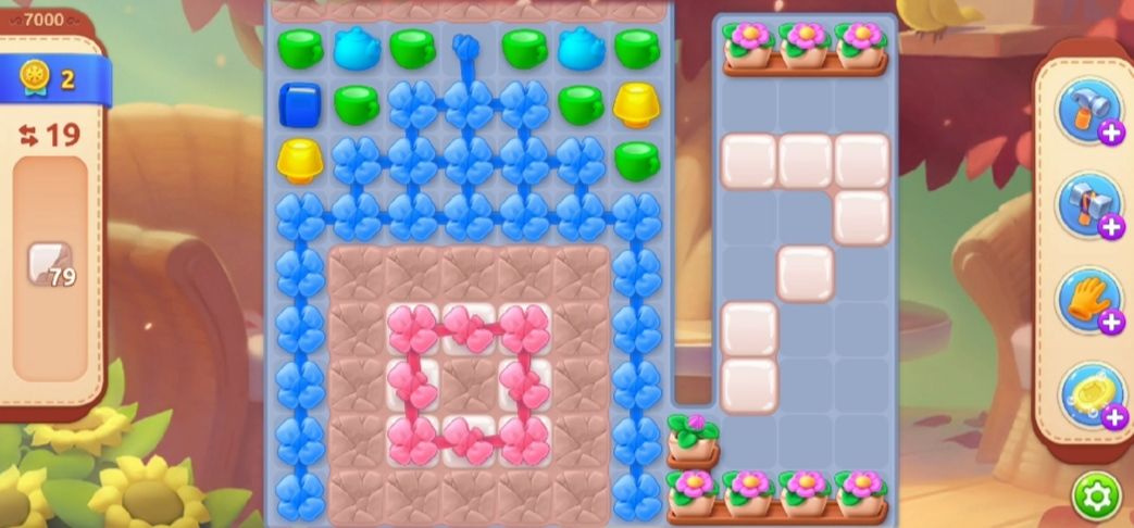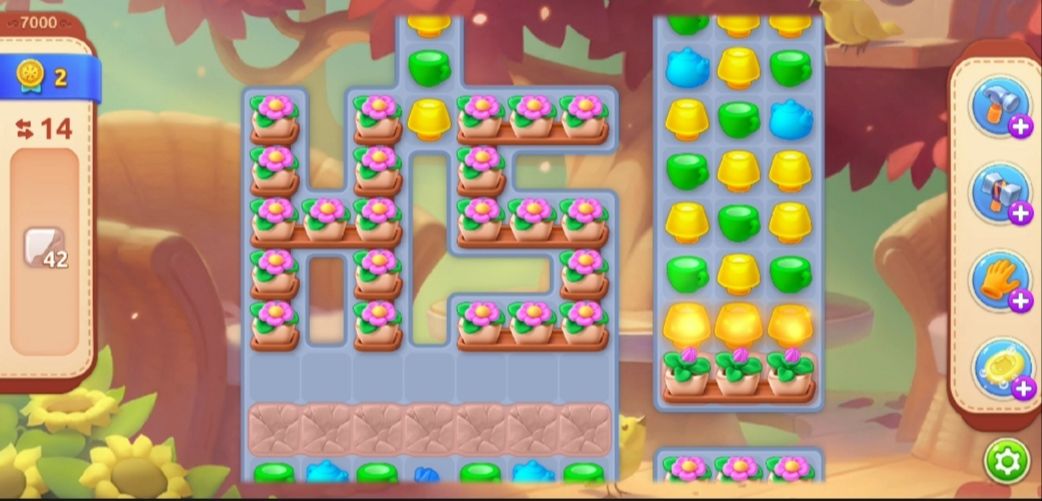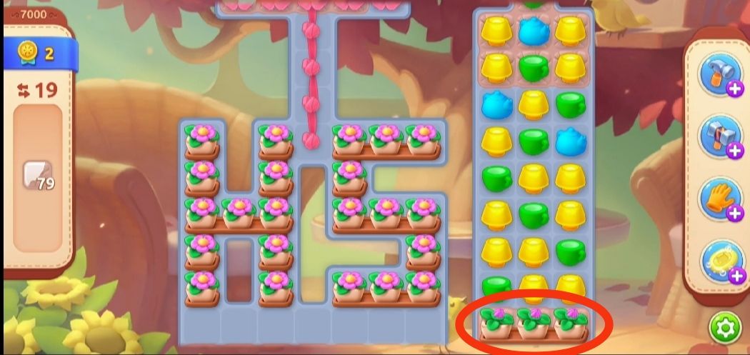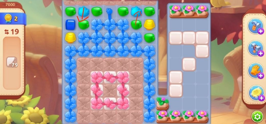 🎉场景二的界面是消除掉这些碍事的花盆元素,看到这3个花盆了吗,把它们消除掉后,其他的花盆也会随之消失,再次露出下方的方砖元素。