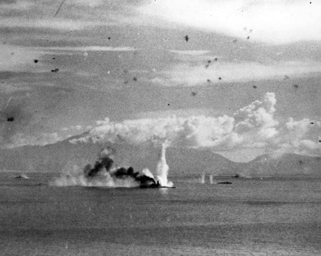 战列舰武藏在锡布延海空袭中被命中一发鱼雷的场景