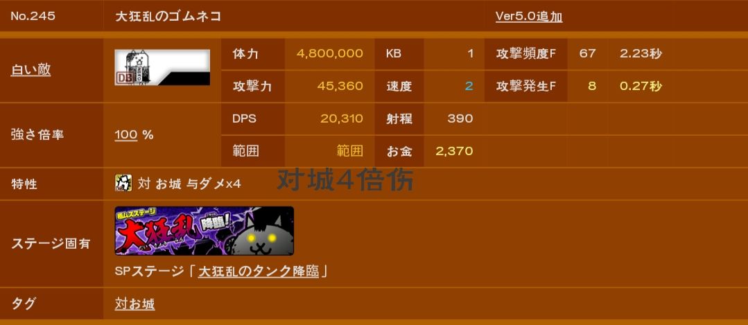 超高伤害,射程也长,攻频也不低,射程低于390的基本摸不到,量产炮灰一击死,大多数人在打大狂墙时都没有能真正稳住的炮灰,不过,经过测试60来级满生命本能加体力联组的拉面王是可以抗住一下的,有能力的可以试一试。回到正题,变态的血量是塔的两倍多,可以尝试偷塔,若要正攻,主力大猫射程最好要在440往上,这关对大狂墙的击退尤为重要,1kb意味着没控制的话它到死都不会退后一步,所以推荐使用狼女等有效击退角色,配合狙击效果更佳