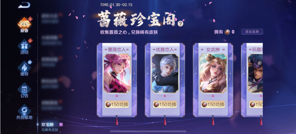 活动常驻入口:活动中心-新春活动-【珍宝阁】兑稀有皮肤