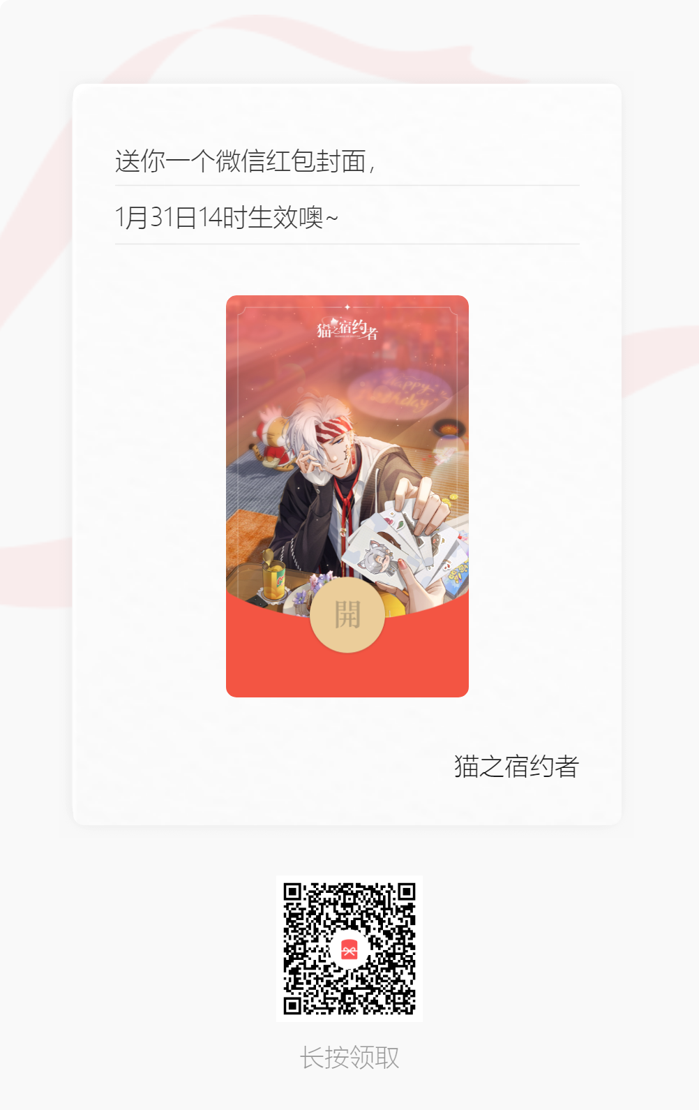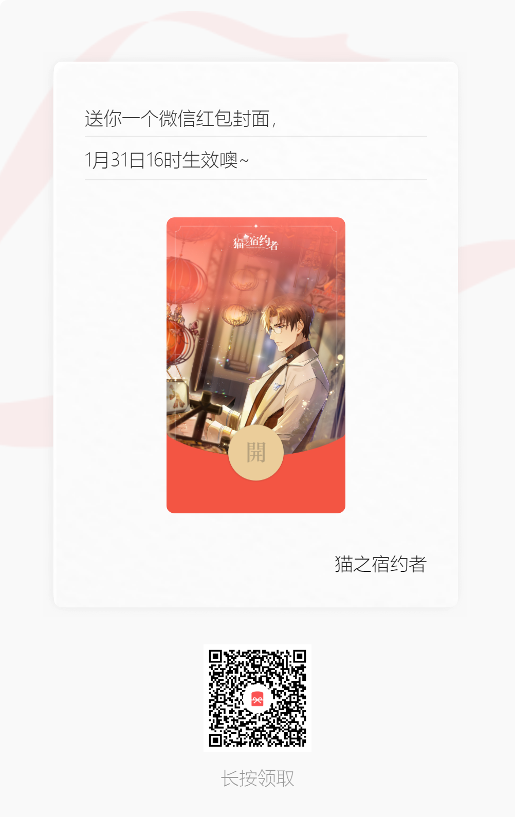 新春降至,阿官喵带着新春贺岁活动来咯,除夕当天(1月31日),各位探长大人记得保持手机畅通,等待你的男友来电。14:00-17:00还有各位男友红包封面限量送出,大家不要错过噢~
