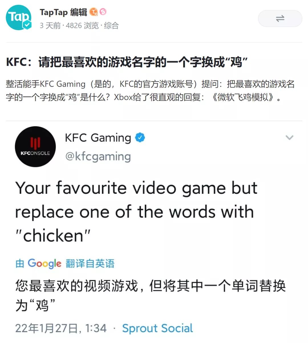 一向擅长整活的KFC在推特发起了一个和游戏相关的话题“把你最喜欢的游戏名字的一个字换成鸡(chicken)”,虽然原本是英文的,不过换成中文好像反而更好玩了: