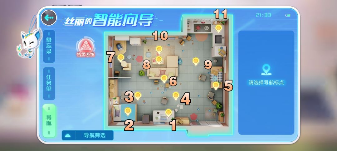 ⑴在导航里选择客厅(10号点),然后往猫窝那个方向,靠近米色沙发那个方位移动,在沙发旁边有个在地上的遥控器,点击看电视。