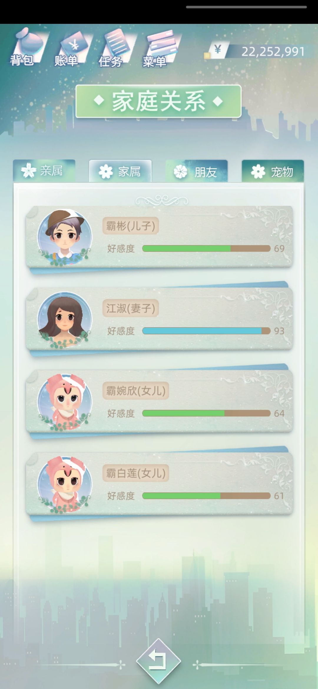 还有一个bug就是我有一次六十多岁,老婆逝世了,然后我就和另一个女孩子不到三十岁,关系很好,关系条都满了,我想娶她呢结果我只要一点表白,游戏就点不动了,只能完全退出游戏再进入,不然你就直接拒绝我,不然就不要有表白这一按键,真是太可惜了!我好喜欢她就是不能在一起!