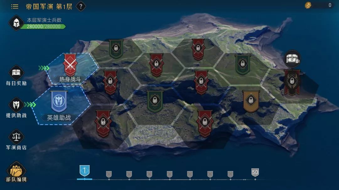 遇到难度较高的军演,一方面可在大地图中进一步提升英雄练度、技能等级和科技方略,另一方面也可借用盟友的英雄助力挑战。