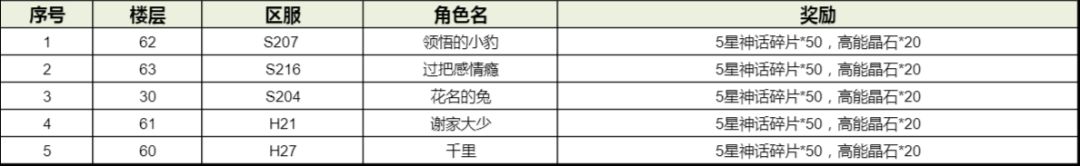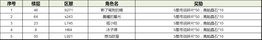 恭喜以下大大们获得“年兽参与奖”,获得奖励:5星传说碎片*50,高能晶石*20