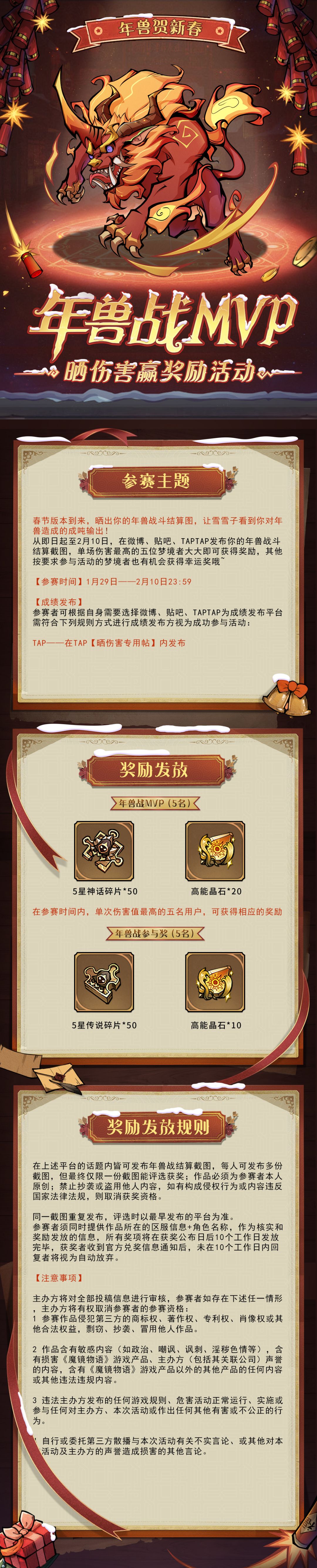 活动期间在本帖评论区晒出您的年兽战斗结算截图,并附上区服+角色名,活动结束时将抽取5名单场伤害最高且符合回帖要求的梦境大大送上“年兽战MVP”大礼包(5星神话碎片*50,高能晶石*20),同时额外随机再抽取5名梦境大大获得“幸运大礼包”(5星传说碎片*50,高能晶石*10)