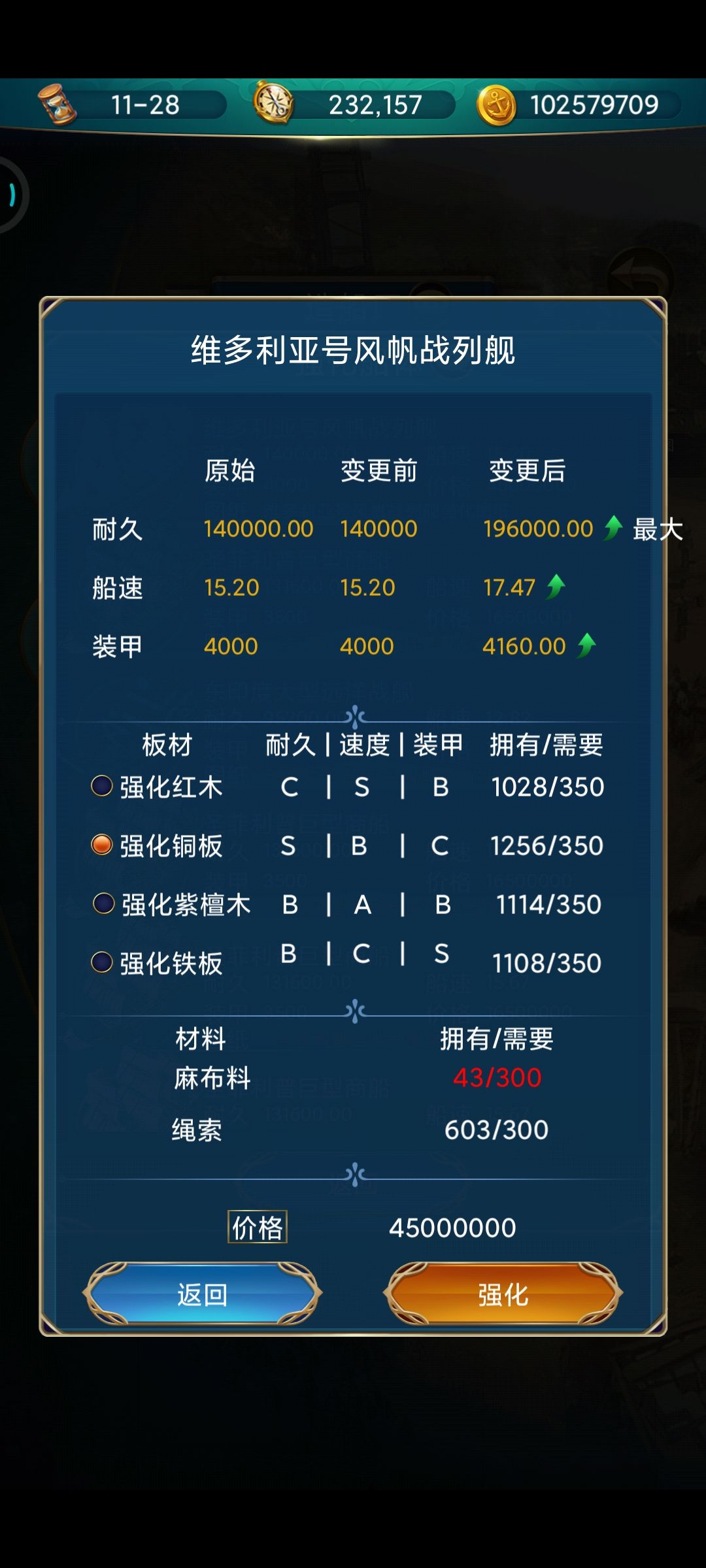 请教各位大佬,圣菲利普强化图,我在加勒比刷了几百遍了,确定这个副本出吗,郑和宝船强化图都打了十张了,我的维多利亚号14万耐久,打徐福出强化图,强化完19万6,带波塞冬+25%,怎么显示耐久22万,不应该+25%是24万多吗,