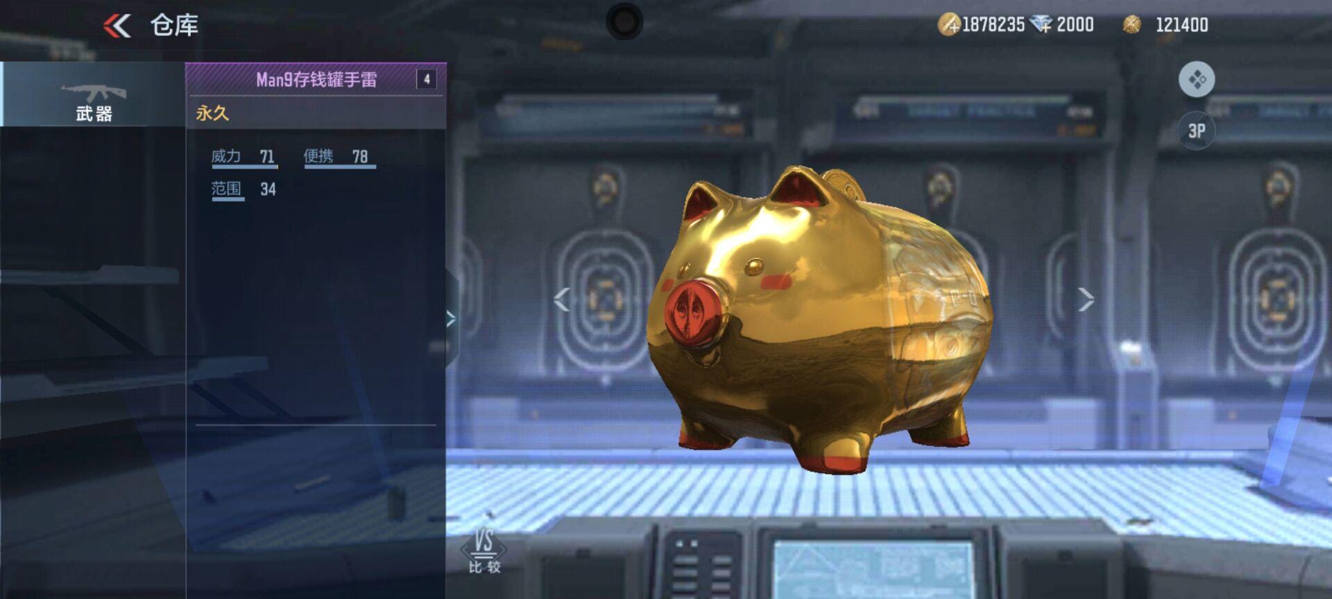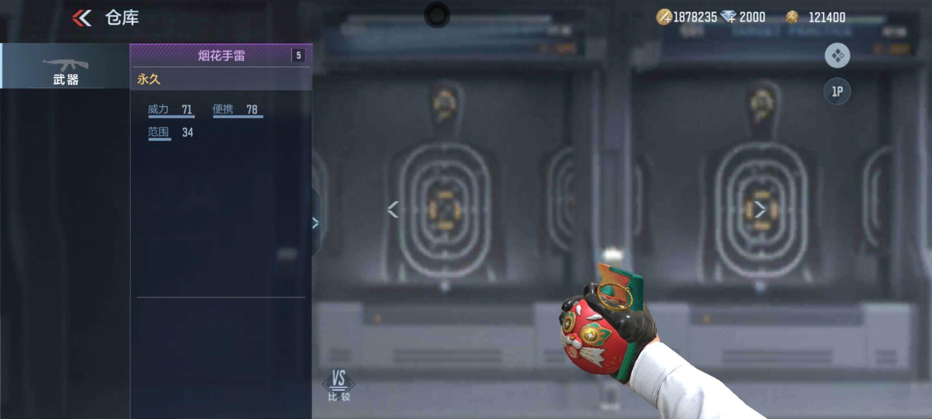 接下来是一个虎头虎尾的手雷-烟花手雷,虎年特色道具。手雷的拉环处多种传统花纹装饰,手雷本体为老虎的造型,正面是一张可爱的老虎脸(有点过于可爱了,甚至有点像猫猫了),背面则是尾巴,造型生动有趣。