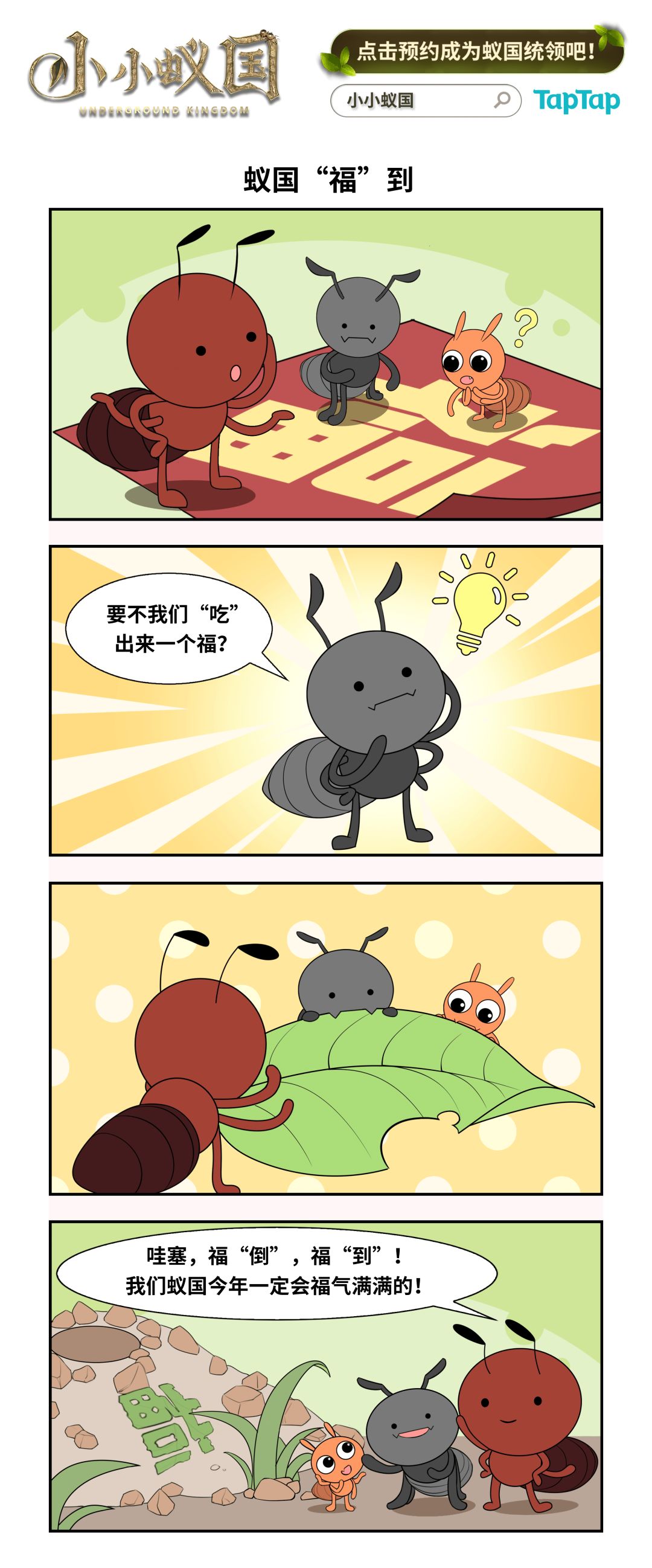 为了迎接新的一年,本蚁还给大家准备了新年红包哦!大家在评论区许下新年愿望或者对条漫:蚁国“福”到,进行二创都有机会拿到!