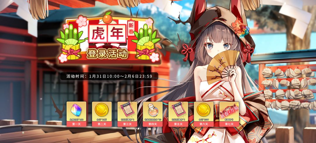 「1/31 5:00」~「2/6 23:59」期间,每天登录游戏即可领取福利~