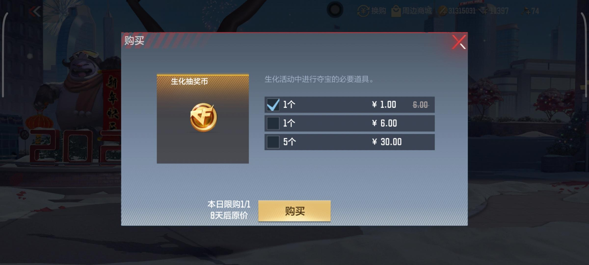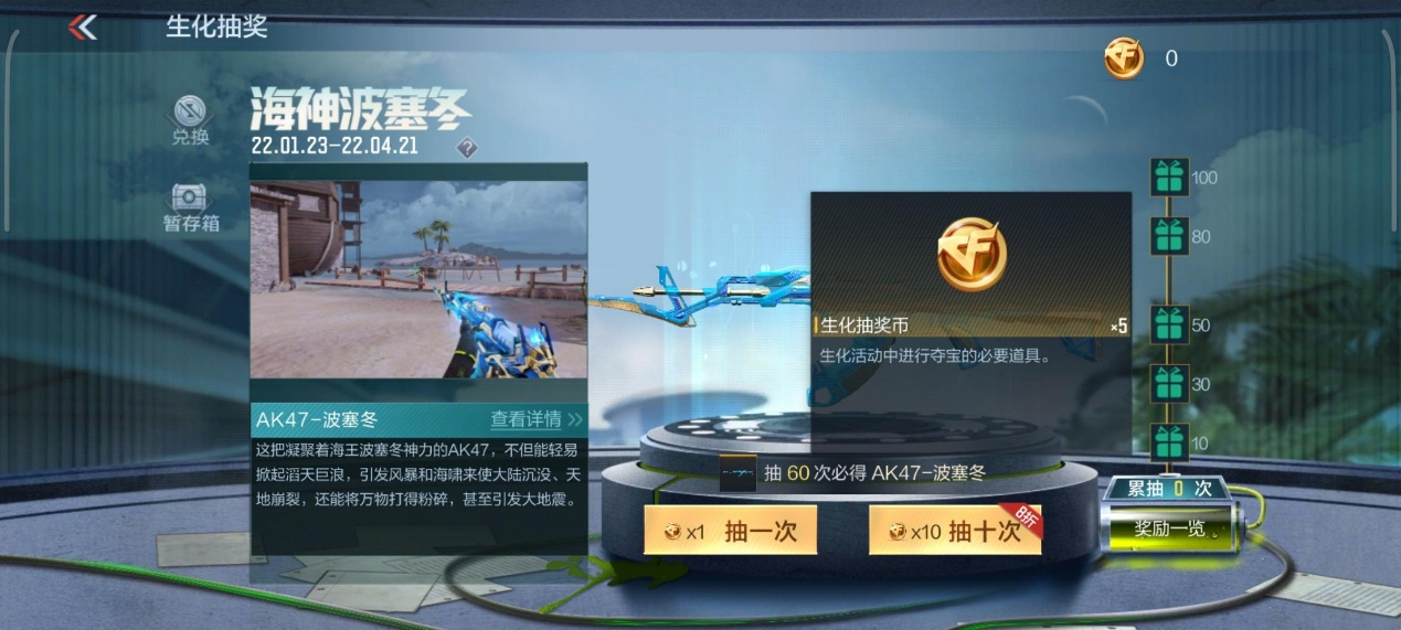 AK47-波塞冬对生化模式人类阵营提升是巨大的,所以AK47-波塞冬是必定要抽的,而本次活动中,抽60次必得AK47-波塞冬,无疑是保底玩家的福利,1月23日-1月31日每日一元限购共可获取9个生化抽奖币,抽到第50次会送5次抽奖机会,那么我们只需要购买46次就能最优的方式获取AK47-波塞冬了。