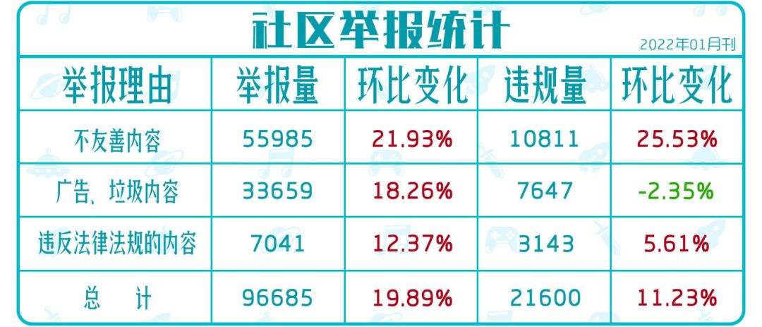 本月总收到96685条举报,环比上月上升19.89%,其中不友善内容相关的投诉比上月增长较多,可以体现出玩家对“清朗”专项整治的肯定和工作上的配合。在TapTap社区管理团队的复核下,处理违规内容共21600条,环比上月上升11.23%。