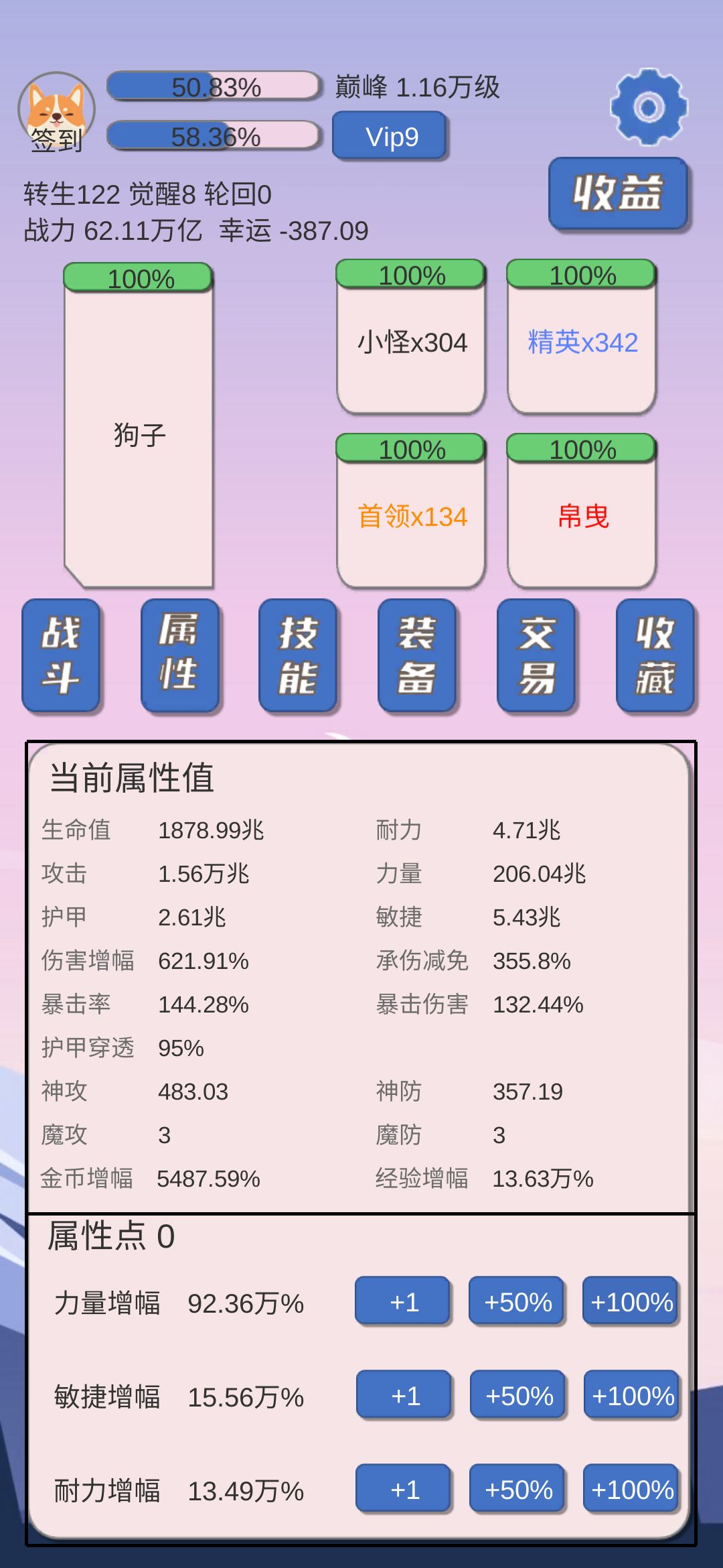 死亡套没啥用,恐怖套还行,打Boss还得是拼死一搏,刷图转生一套搞定属性全是金币经验幸运,所有装备都是宝箱开出来的超省心,照样洪荒500