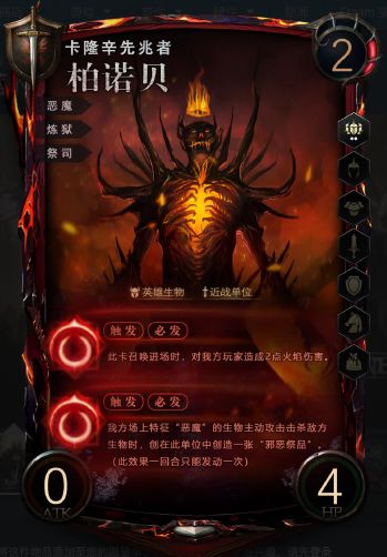 在此基础上,就可以发现利用祭品抵挡进攻伤害及堆异次元的方式里,柏诺贝的作用是十分巨大的,每回合都可以生产一个祭品(恶魔击杀对方英雄携带的部队也可以触发),保证我方利用两个祭品挡住一次粉碎攻击后,而本个大回合不会亏祭品的数量,因此进攻时需要考虑我方是吃柏诺贝的祭品保证场面安全,还是吃场面的祭品来卖血保柏诺贝。