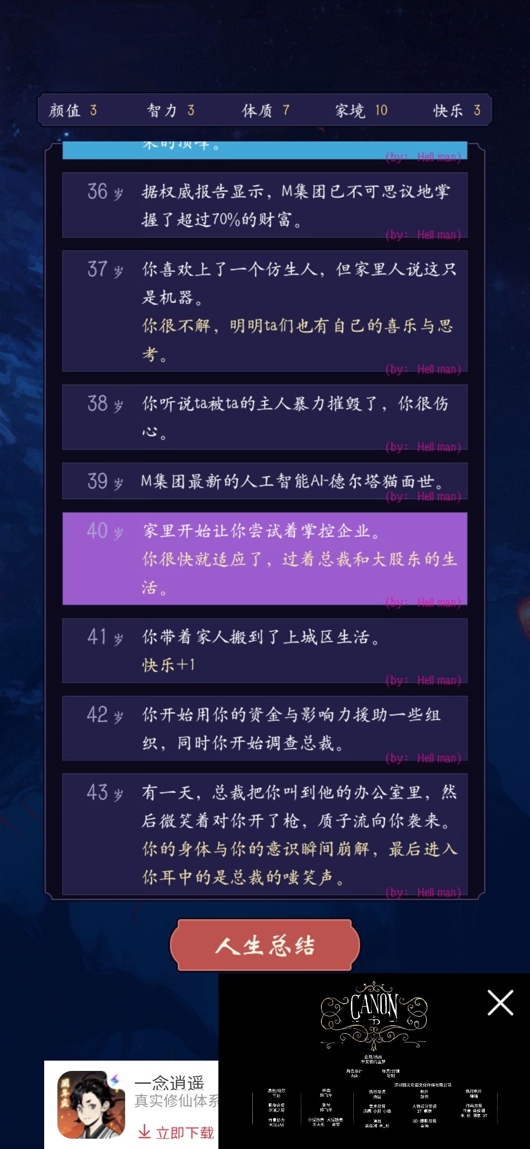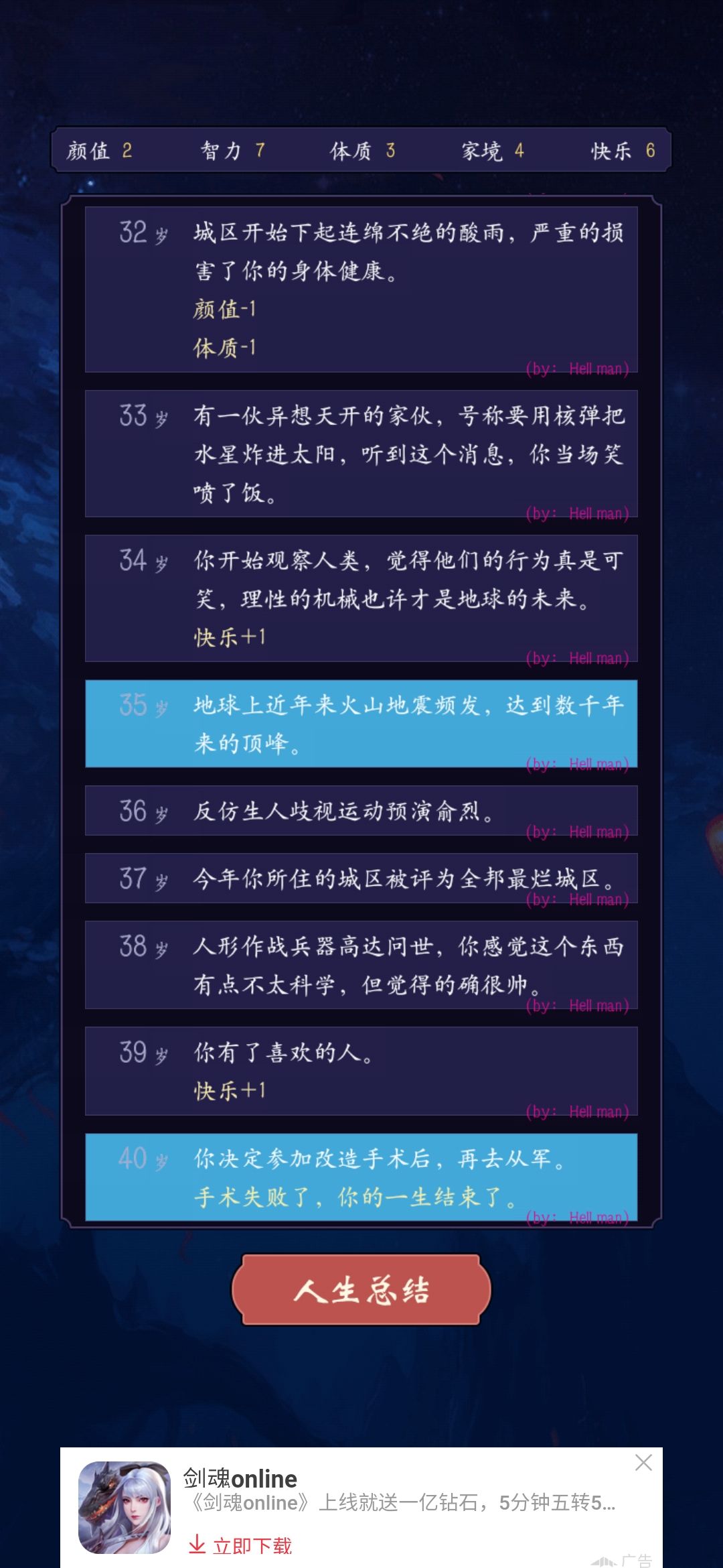 图八:阳电子炮致死(这里也是必死事件,而且到五六十岁的时候必定触发,也就是说这个天赋作者应该还没有更新,目前只有死亡结局)