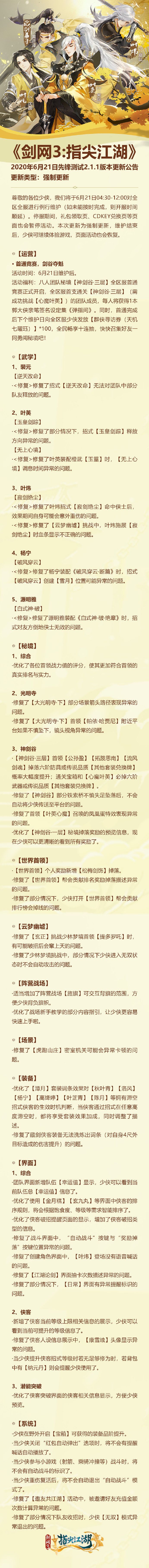 《剑网3:指尖江湖》2020年6月21日先锋测试2.1.1版本更新公告