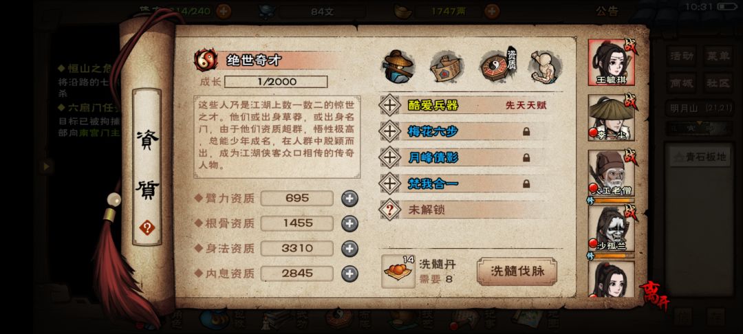 60级,泠月极限三阶出师,全是上乘,轻功还是梅花,由于太突然,我没来得及录制,只能截个图,大家可以参考一下