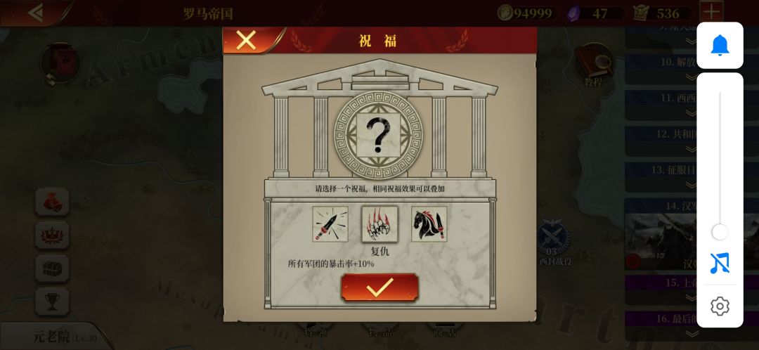 决战刷哪个,可能各有见解,零氪党首选效益最大化。决战单次最大收益50勋章,只有13和14章的主线和支线可以达到,这里面我主推14章支线决战,主要是汉军骑兵战斗力和技能确实强悍(降防40%),且我的阵容以骑兵为主,每天大概要20分钟刷完两次,偶尔也会卡住崩溃,20%情况是一遍成,70%需要略微调整装备,10%卡机需要大调整装备和进攻策略。