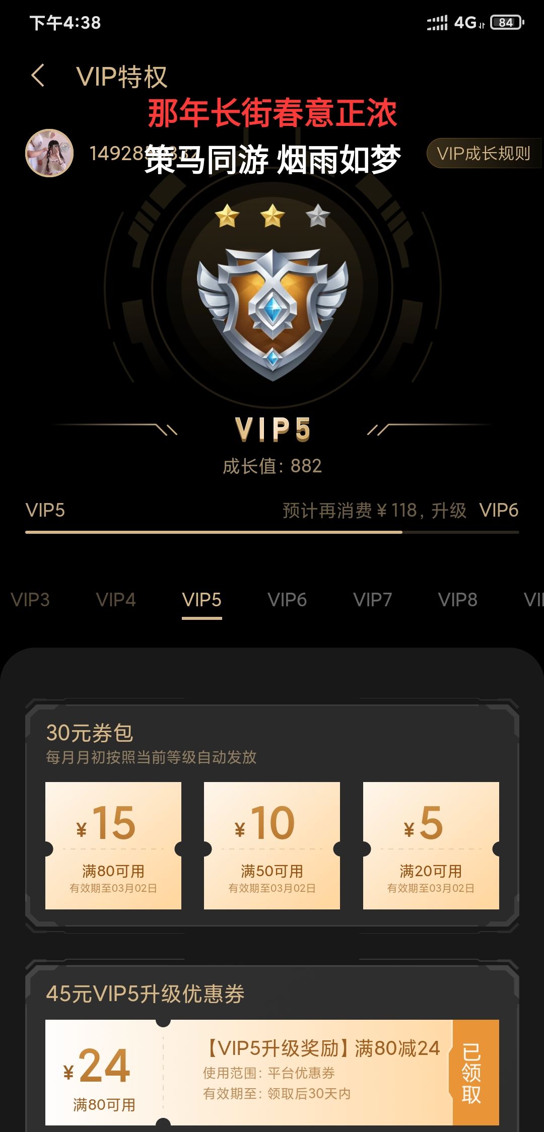 p3/4我自己手机上游戏VIP待遇(我开通年费了,一个月四张15元通用卷,以及大额卷)