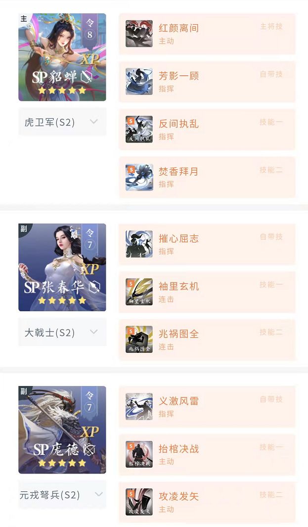 由于SP庞德可以无视反叛状态敌人的防御、智力,配合SP貂蝉能打出更高的输出水平,建议使用高伤害率、高收益的武技较为合适,推荐抬棺决战+攻凌发矢或怒目退敌+横甲刁军,提升庞德的点杀能力。