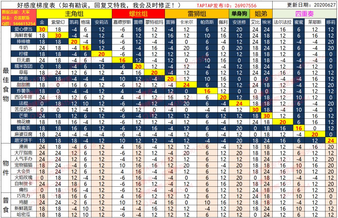 凹凸世界 送礼物 羁绊值 好感度梯度表 (2020年6月27日更新)