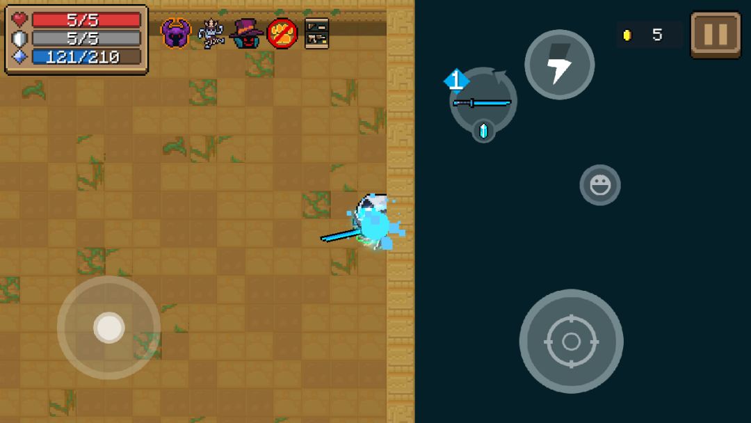 攻击分为三段,前两段为挥砍,第三段是向前发出一道斩击(只有第三段耗蓝),皆可以消除弹幕,使用时提高移速;若产生暴击,则额外触发一条长斩击(伤害为5点)。