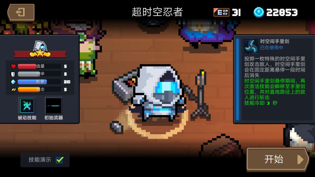 解析:超时空忍者本体较脆而强度足够,所以各种保命天赋优先选择;武器我更推荐初始武器,伤害够也能苟,搭配近战范围增大完全可以当做远程武器来用。