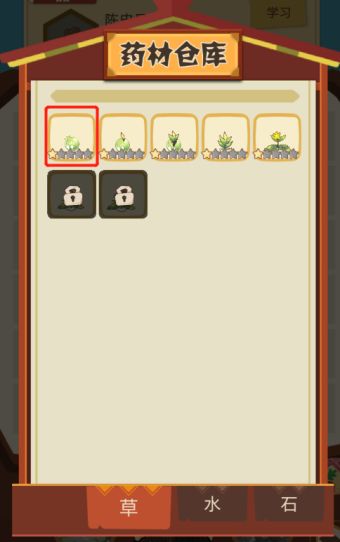 4)【拖动】屏幕上的药材,把三个相同的药材放在相邻位置,通过三合一小游戏生产药材。