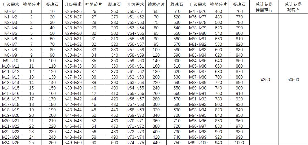 升100级共需要神器24250碎片,凝魂石50500个。
