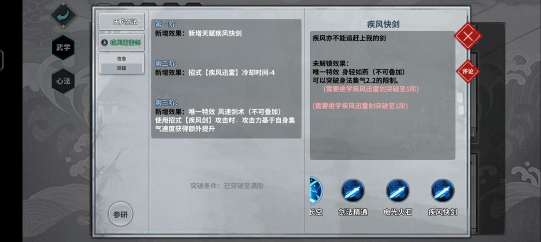 天风剑法本身可以增加连击概率,而进阶后的疾风剑更是一门顶级辅外。