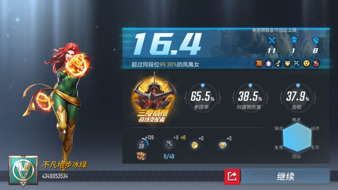 凤凰前期经济优势很重要,什么时候出了三大件什么时候开始发力,所以如果队友老来抢你的经济,你就废了,对面经济比你好,你不出到五件套就使终干啥啥不行……一般正常出到四件套就很强了,五件套横行天下~一个打几个~越塔强杀~不是梦!凤凰出完三件套,经济上优于敌人,就形成碾压,对面长攻近战随便来,灭霸浩克勇度我都追着耗死他,杀不了也可以打到跑回老家~凤凰赶路记得开金盾,跑得老快了~凤凰没什么爆发伤害,主要是持续伤害高,带制裁一是想要人头可以试试,最主要的是防中期被针对,比如狼躲哪里,等你黄色圈圈刚完直接贴身开大,就上制裁等这个稳定的输出技能冷却,不然白白给他们大招加持的两秒狂砍,可能最后就打不过了(有的会带那个加移动速度的技能,所以跑是不稳委的,一个制裁反杀比较合理,因为他开大了他自信,不到最后不会跑)……至于大招,可以有就放,也可以地图上有两敌人和队友交战了就立马放,或者队友逃命时放,利用冬棺的减速远程支援下~至于大招收人头……看人个爱好吧,只能告诉你效果并没你预想中的好,当然,对面不会除外……有一个不好的地方,我经常团战两技能丢了再切出两技能丢出去后,再切就没反应了,人可以随便走…得把技能盘点一下盘才会亮,才能继续搓技能,不知道是不是手机的原因……最后附上两张图让大家看看笑话,最后了才想起来截两张图……对于对凤凰女和她的技能不了解的可以去档案里查看英雄资料介绍~