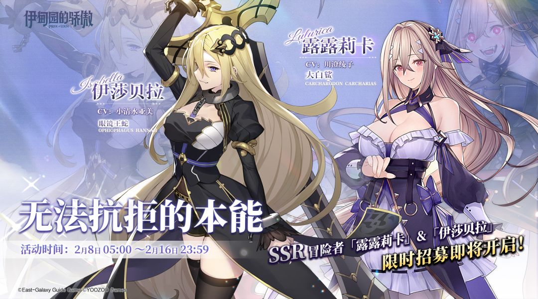 2月8日5:00起#伊甸园的骄傲# 游戏内将开启「无法抗拒的本能」限时招募,SSR冒险者「露露莉卡」、「伊莎贝拉」出现概率占SSR冒险者出现概率的50%,欢迎Leader参与招募~