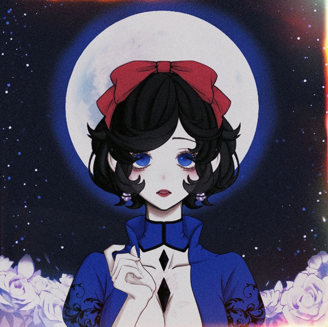 背景的话是圆月白玫瑰和远处的城堡(城堡被白雪挡住了),应该就象征着一种高洁清高,和最后的结局是王子娶了白雪(说实话我觉得王子不配🌚)