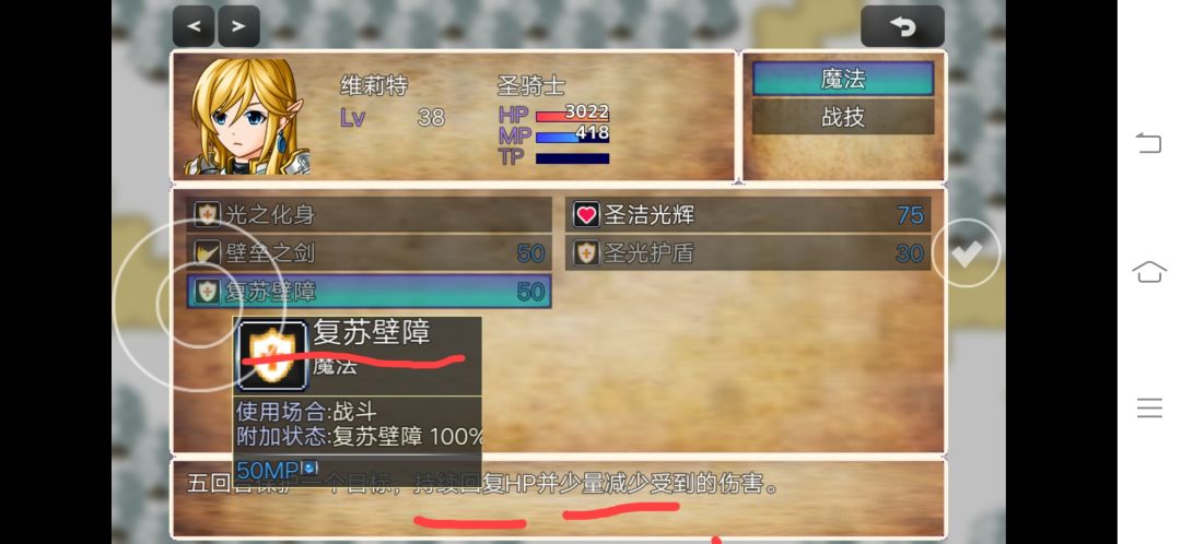 这个技能描述有点模糊了,复苏壁障,具体持续恢复多少HP?至少要像鱼(消耗品)这个道具一样有这个5回合恢复百分之五十的HP的介绍,还有减少多少伤害???这里也没具体多少百分比介绍。