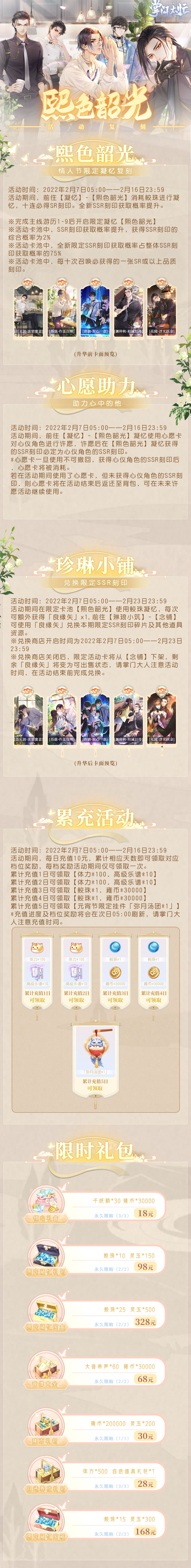活动期间将复刻情人节限定凝忆【熙色韶光】,SSR刻印概率提升并限时加入五位男主的限定SSR刻印: