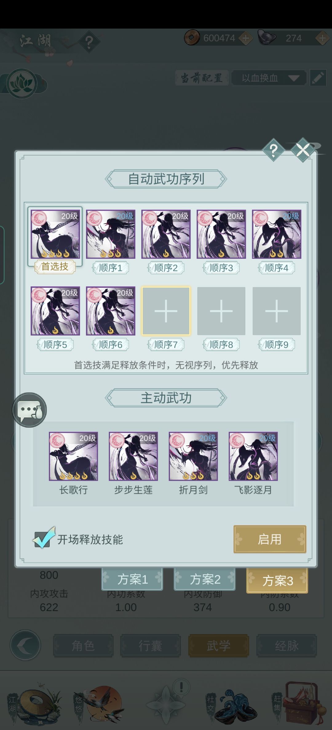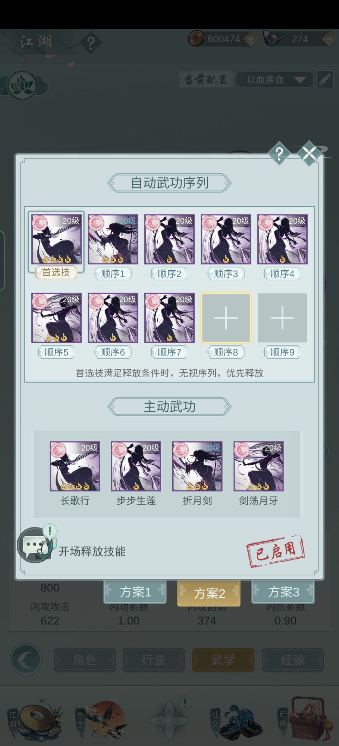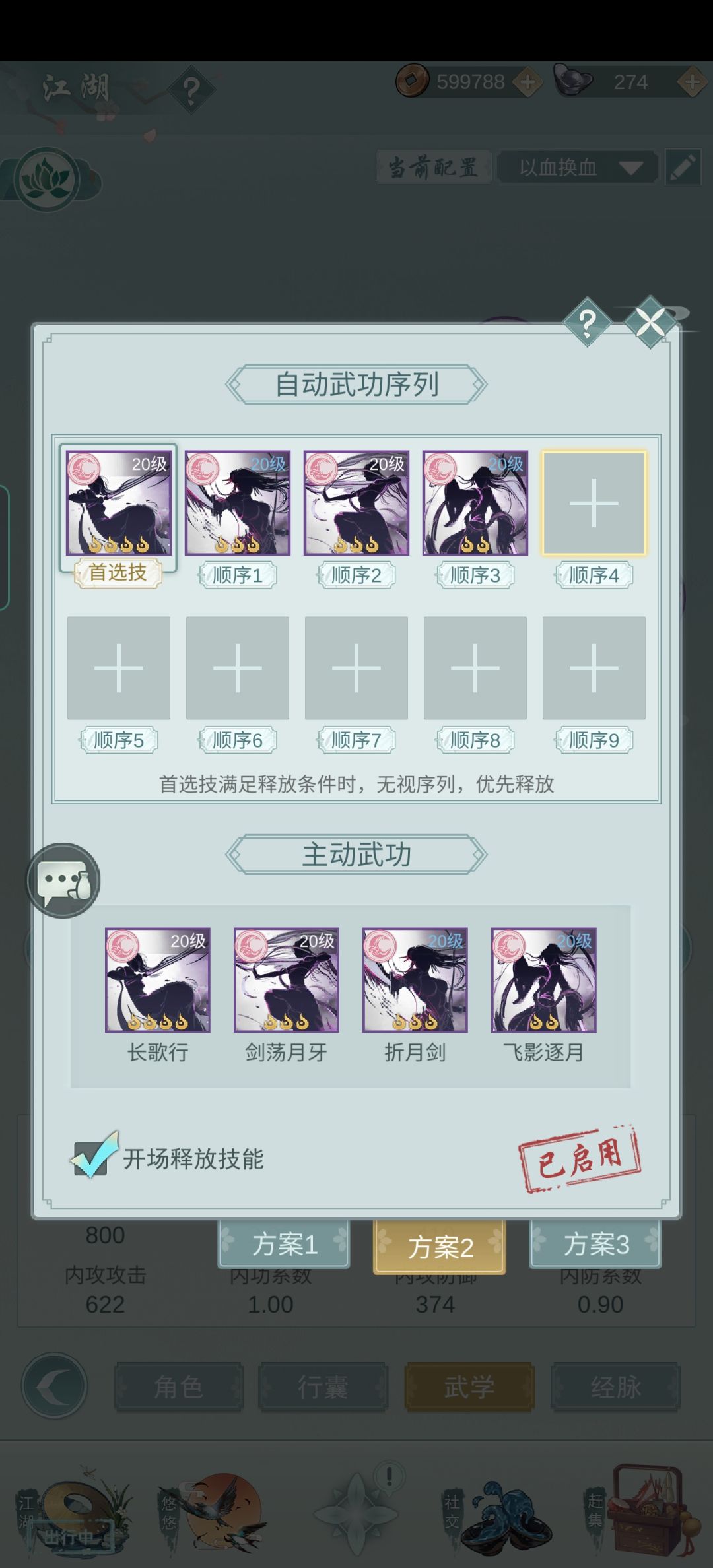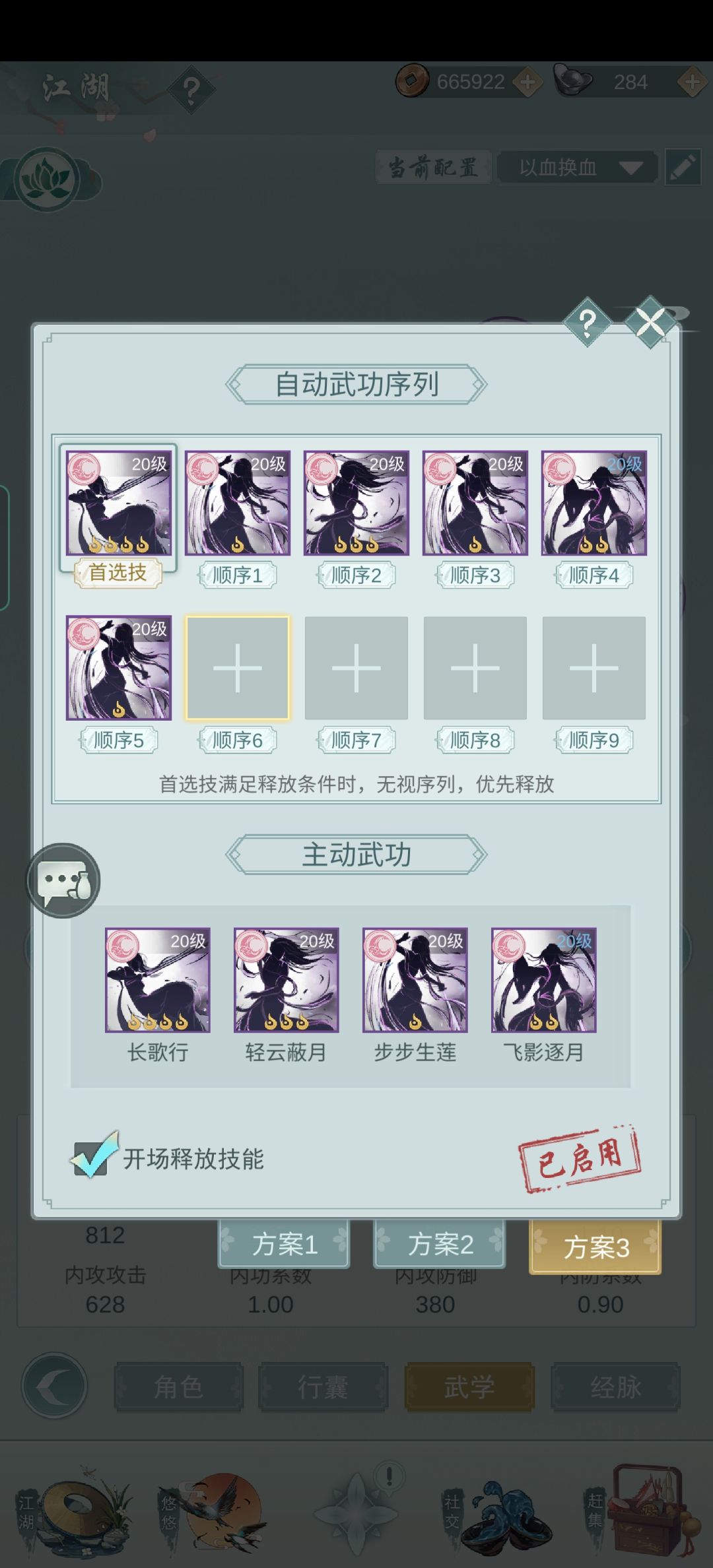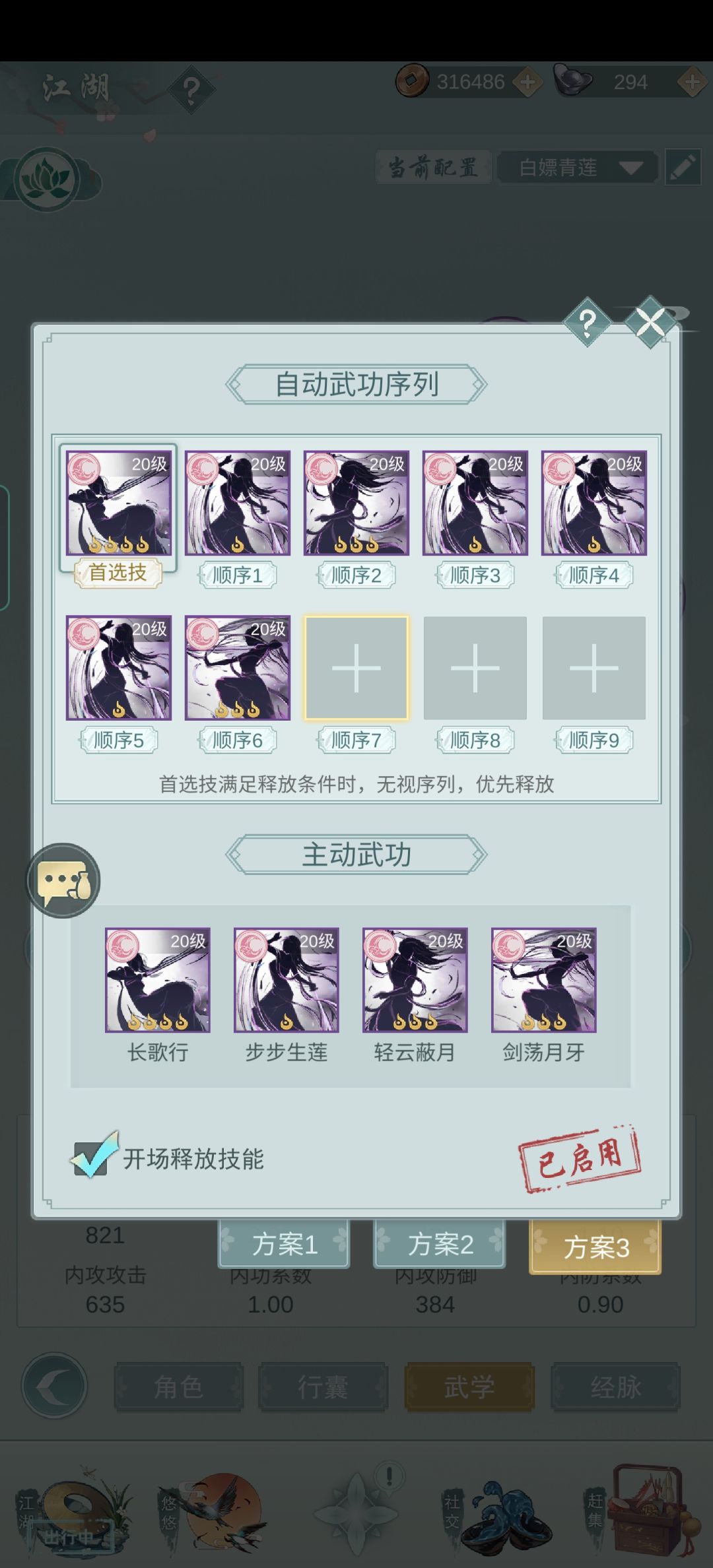 青莲的叠法:中间卡一个步步两个武学不一起释放即可