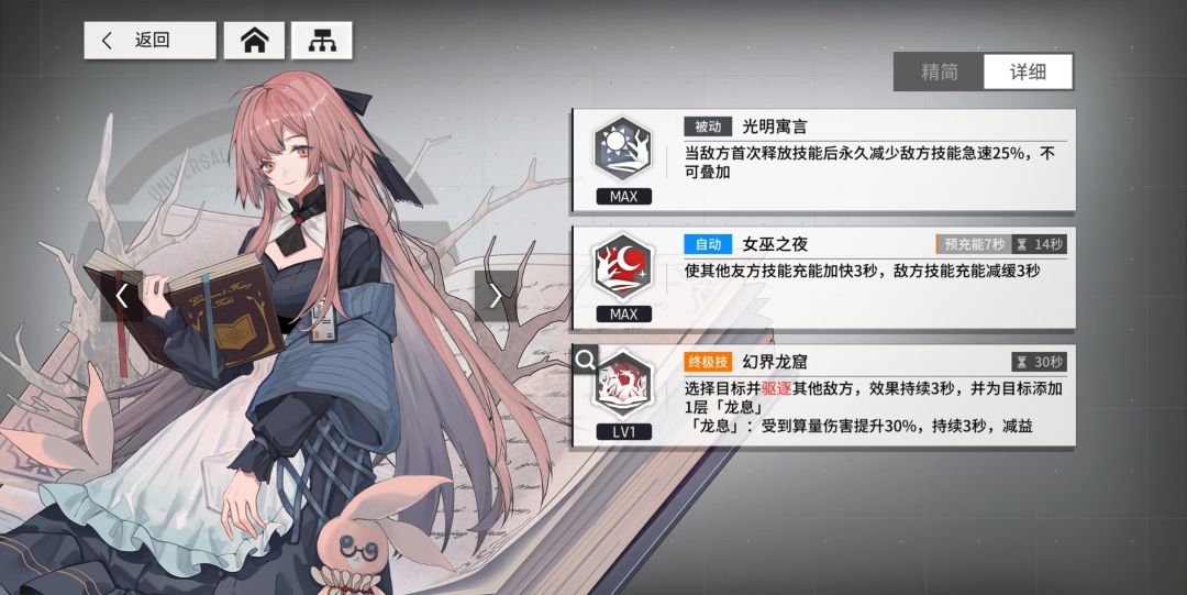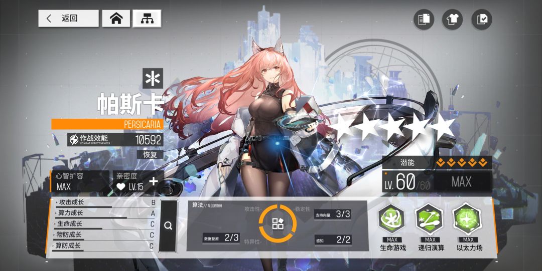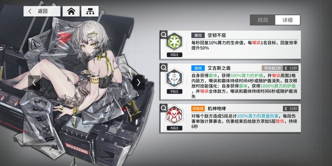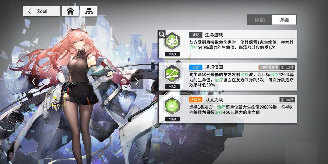 优秀的单体辅助,能够提供一个友方人形40%的算力或者攻击力,但是缺点依旧很明显,无法自奶,给友方人形提供治疗时会罚站,而且治疗量并不算是很高,只能说用来四保一,但是目前并没有输出很变态的c位,还需要以后看待策划任何决定。
