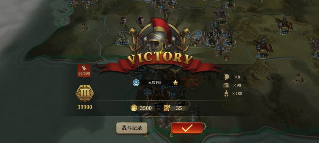 共计耗时65回合、任命8名将领、占领并发展了98座城镇、剩188支军团