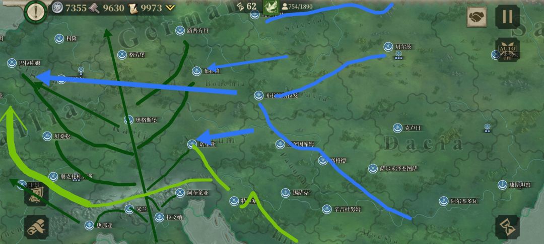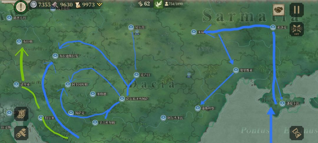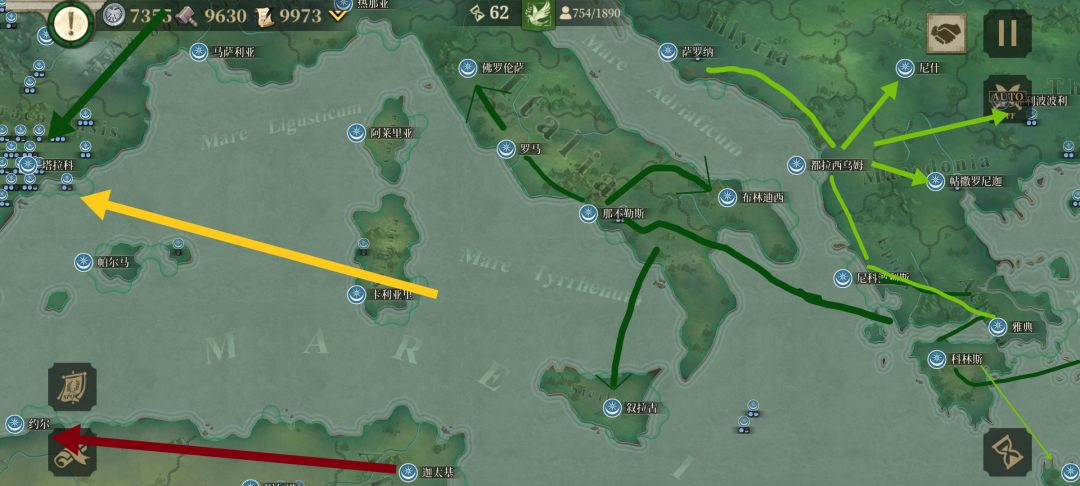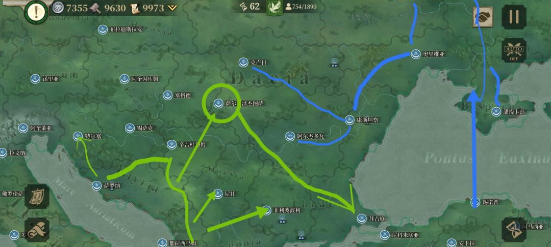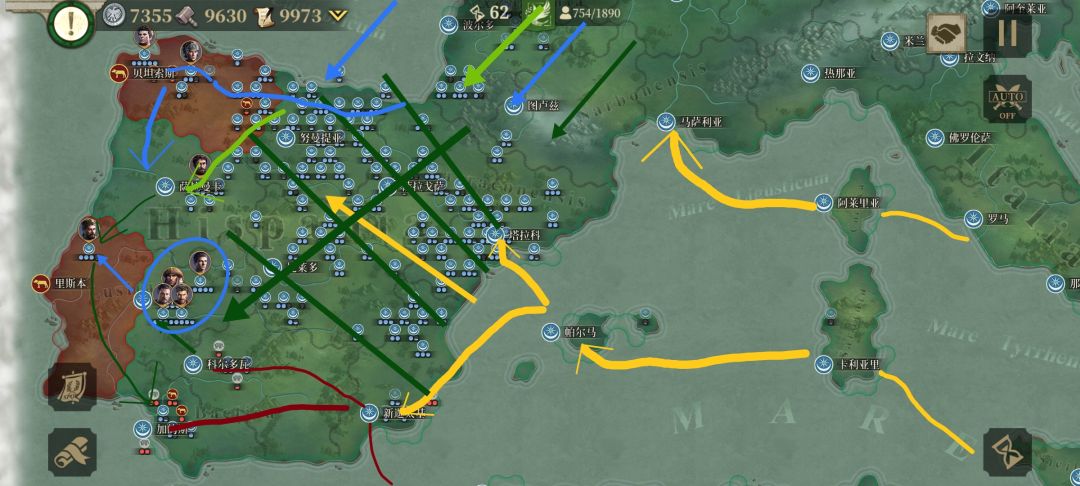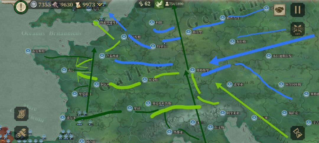 4、指定方案,第一远征军(A)越过爱琴海,占领罗马 克拉苏的大本营雅典后,分一支往巴尔干地区打去,一支灭罗马 克拉苏残余,大部队登陆亚平宁半岛,从罗马 凯撒本土后方打去,抢先一步占领罗马,并在亚平宁半岛北部展开攻势;第二远征军(B)越过黑海,登陆现克里米亚半岛,从东欧平原一路打到日耳曼尼亚地区,并分一股兵力协助A远征军的分支稳定巴尔干地区,基本完毕后,A远征军与B远征军在日耳曼尼亚地区会师后,共同进入高卢地区并南下进入伊比利亚半岛;第三远征军(C)越过东地中海,灭埃及王国,沿着北非海岸线打击罗马 庞培,并分一支海上撞击队从地中海登陆南高卢地区、东伊比利亚地区协助A、B远征军的正面进攻。