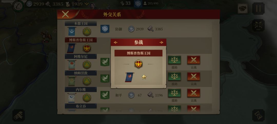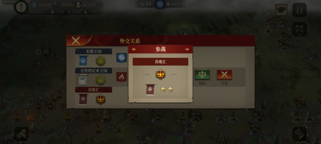 5、我本着见好就收、远交近攻的原则和对本局整体形势的判断,决定从东到西无论盟友、敌人一并通吃,待盟友的势力在慢慢减弱、离我的军队越来越近、落入到我方军队后方,趁势宣战,直接占领城镇。