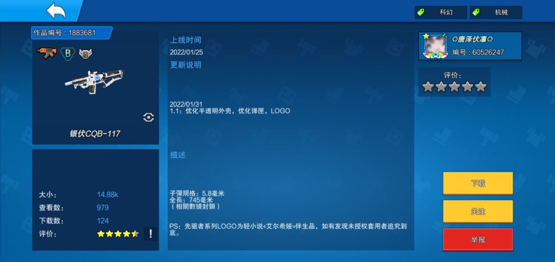 作品要求:发布超过一个星期 下载量低于300 原创作品/真正的授权改模作品 质量良好的