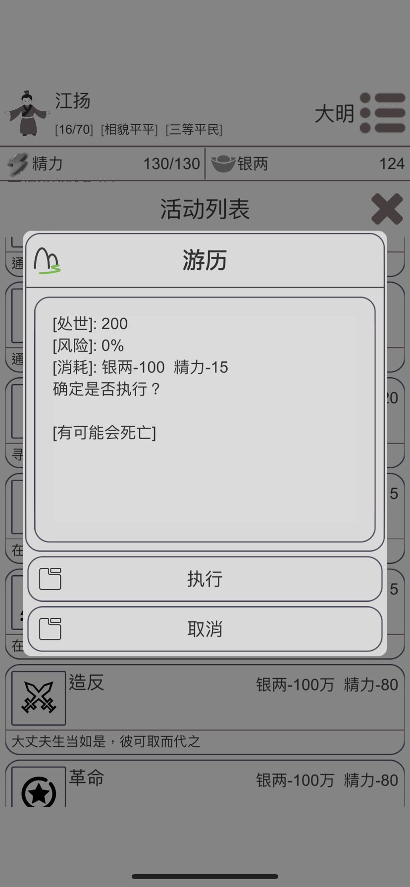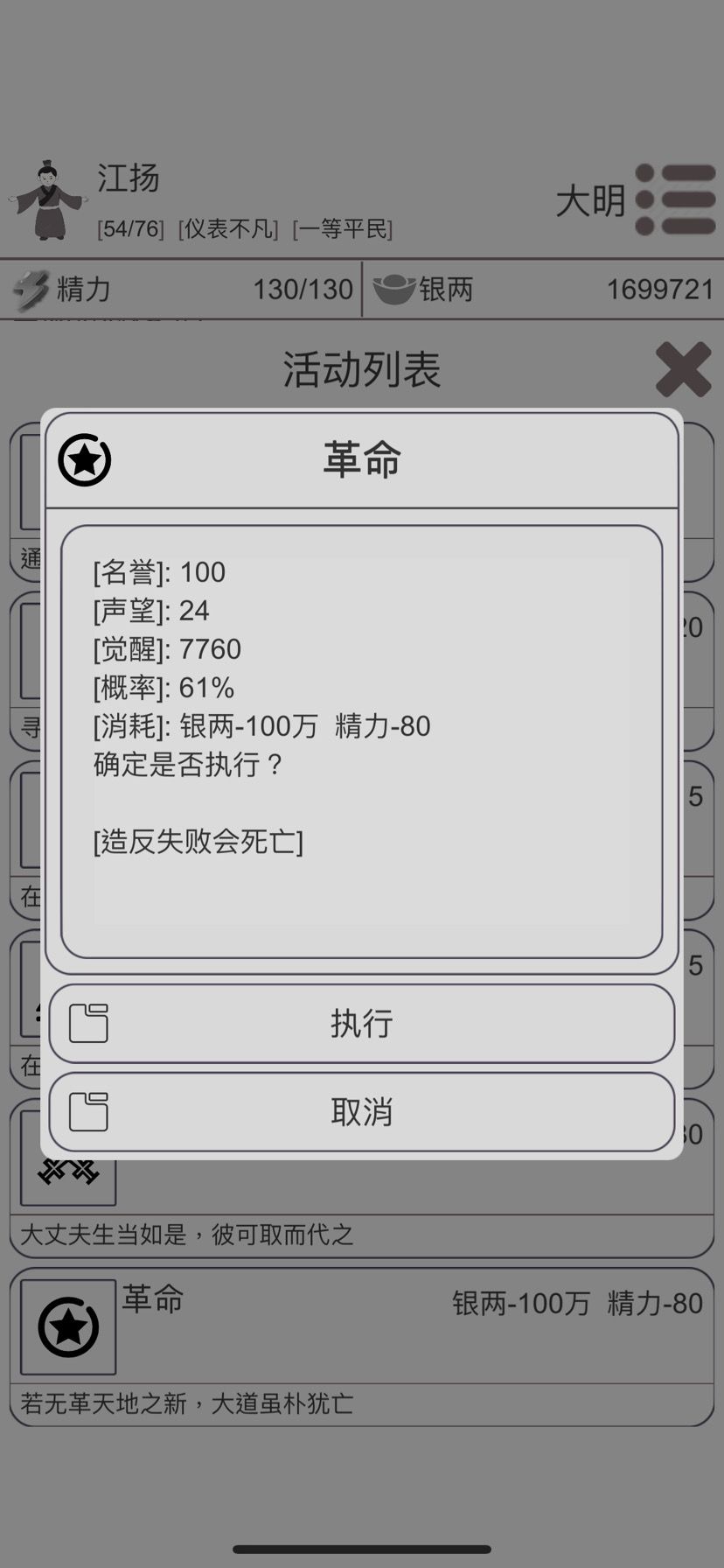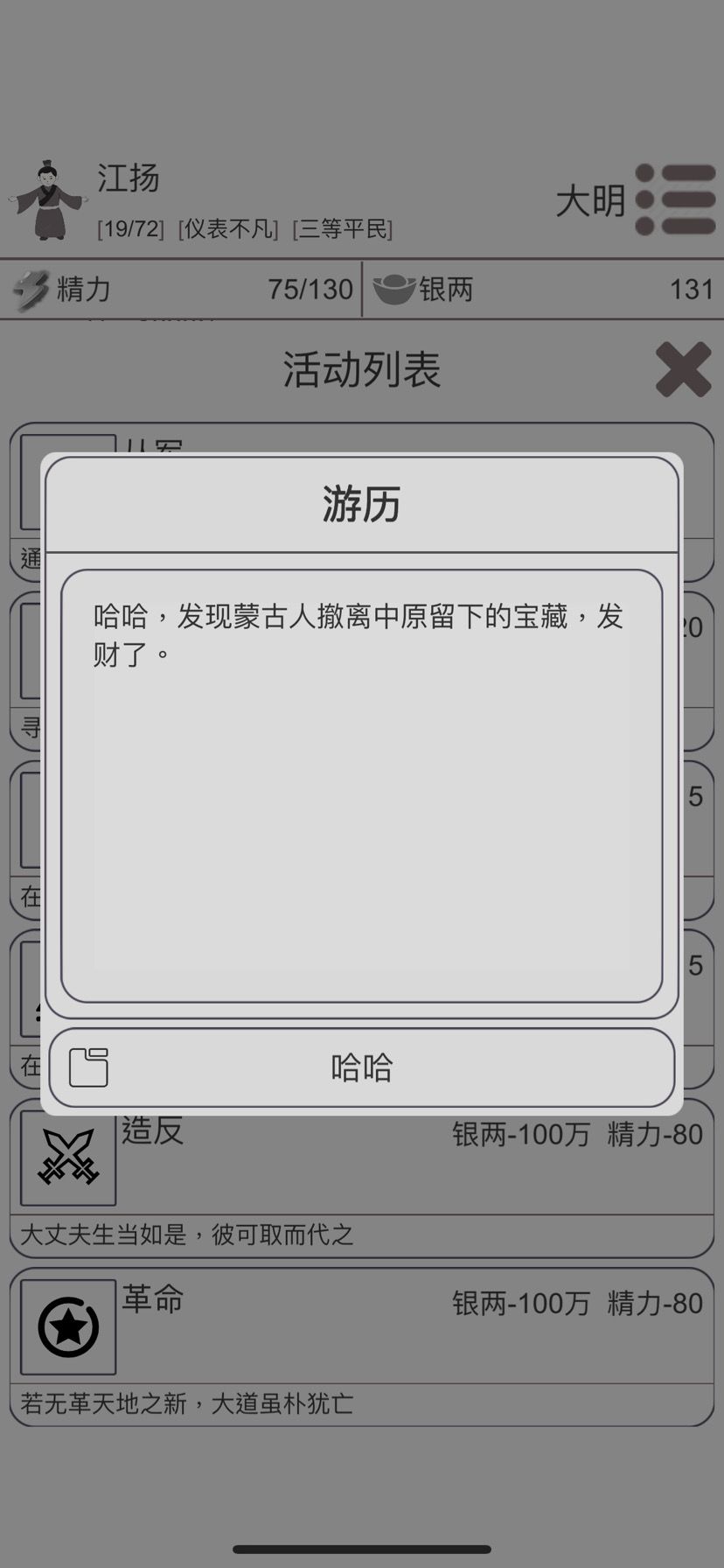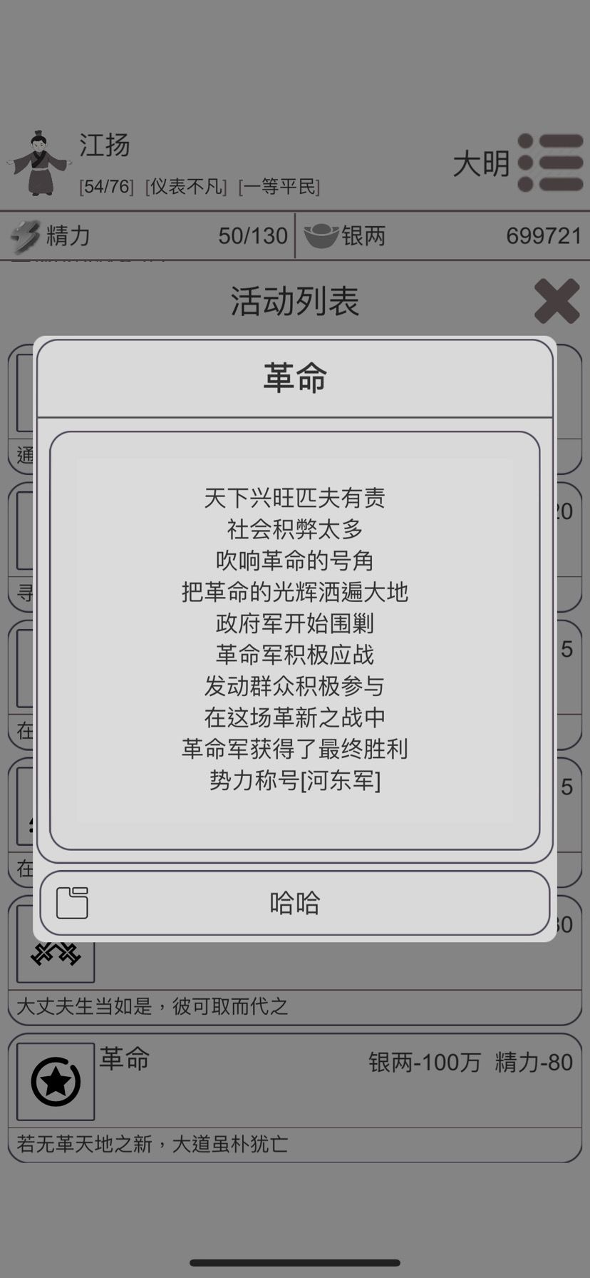 5⃣️楼主这局53岁革命成功率百分之五十六,但是钱不够了,又去游历,54岁钱,精力都够了,不墨迹直接革命,翻身做主人。