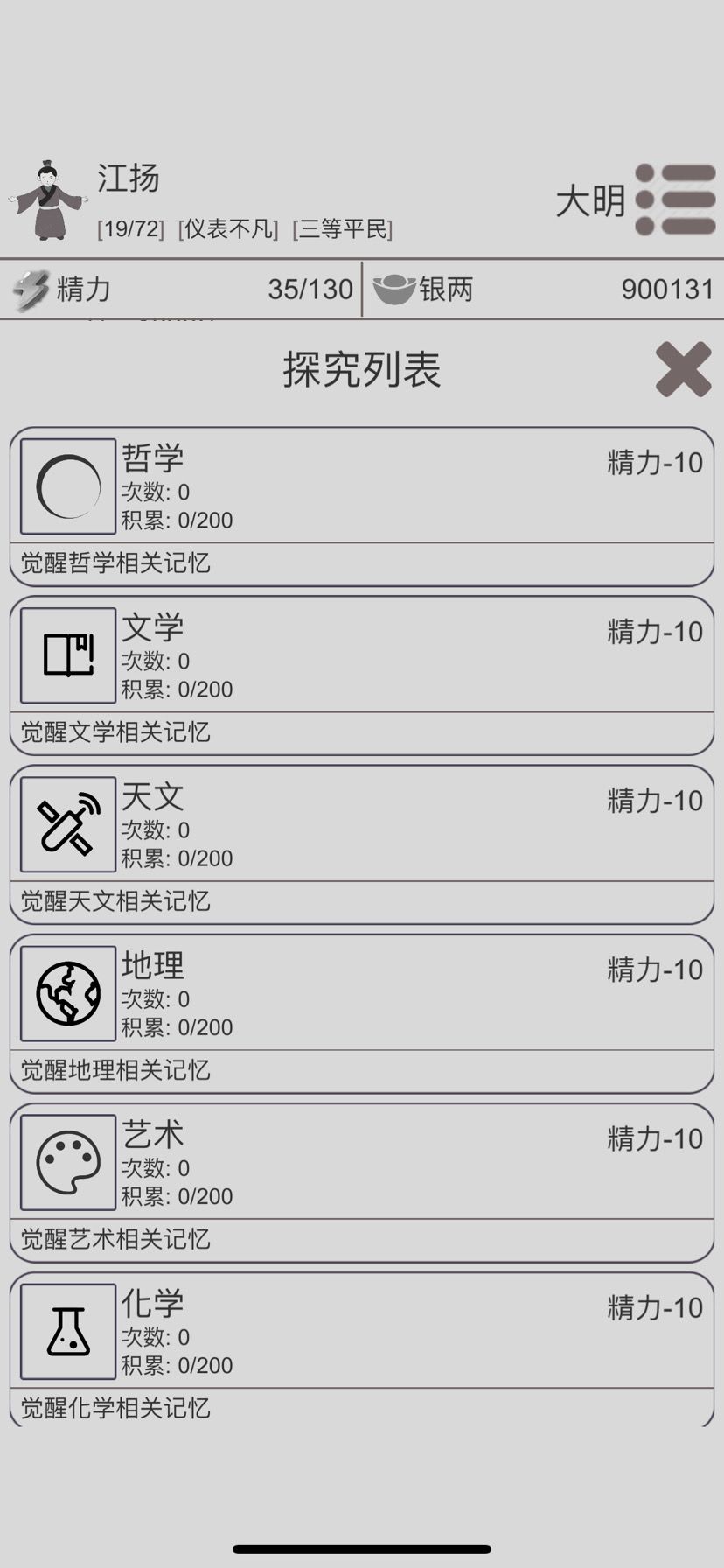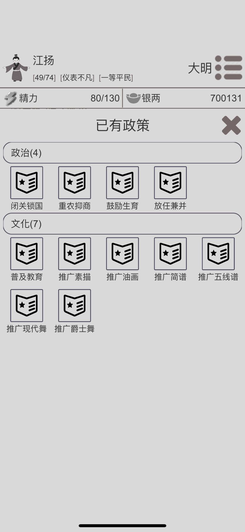 4⃣️接下来就干一件事探究里面学艺术,每积累200解锁一个觉醒相关政策,解锁以后第一时间执行,当你解锁并执行以下六个政策以后,觉醒值每年稳定提升,达到5000以后革命概率开始提升,每年自动提升百分之三,革命这事基本成了。可以继续孝顺孝顺父母升升名誉,名誉和声望都提高革命成功率,声望太麻烦,楼主省略了,接下来想干啥干啥,没几年活头了。