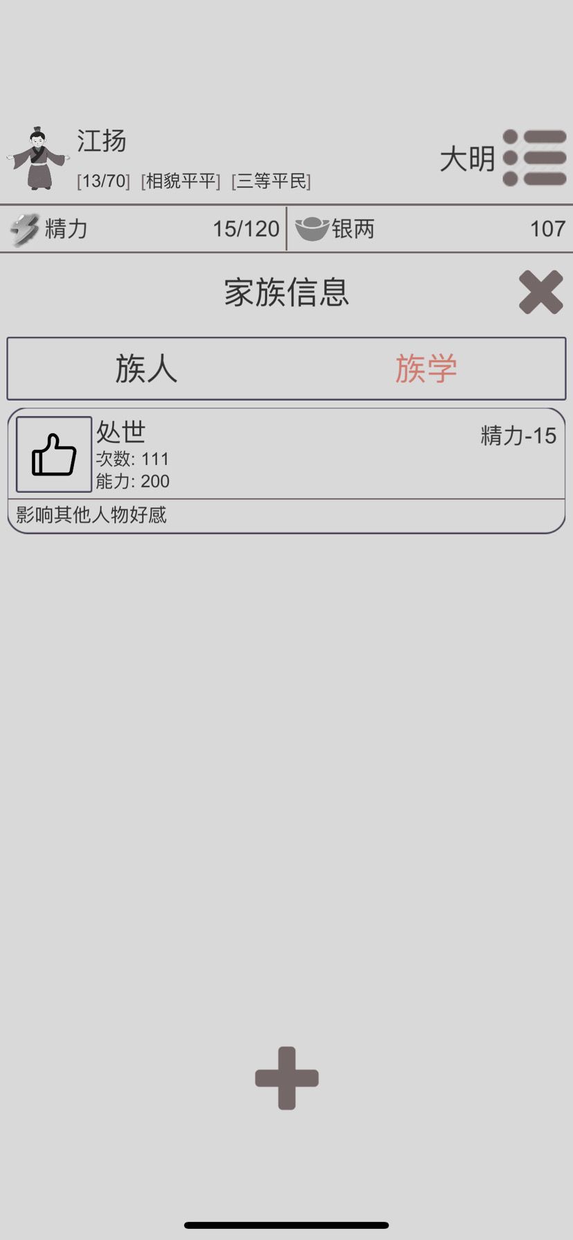 2⃣️处世拉满,游历16岁才刷新出来,年龄不够,先去孝顺父母升点名誉,能升多少升多少,等16岁可以游历了就去游历找100万革命启动资金,游历一次100银两,没钱就工作做管家,赚了钱继续游历,楼主19岁终于喜提100万!