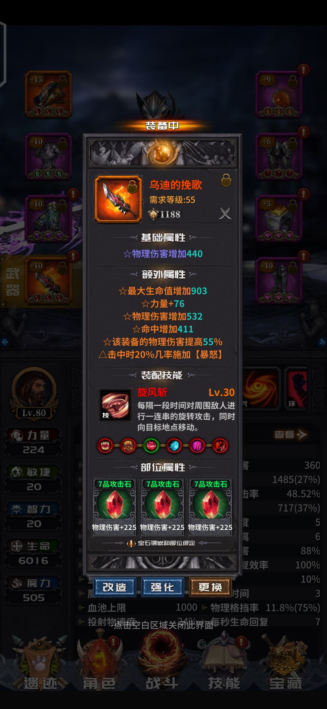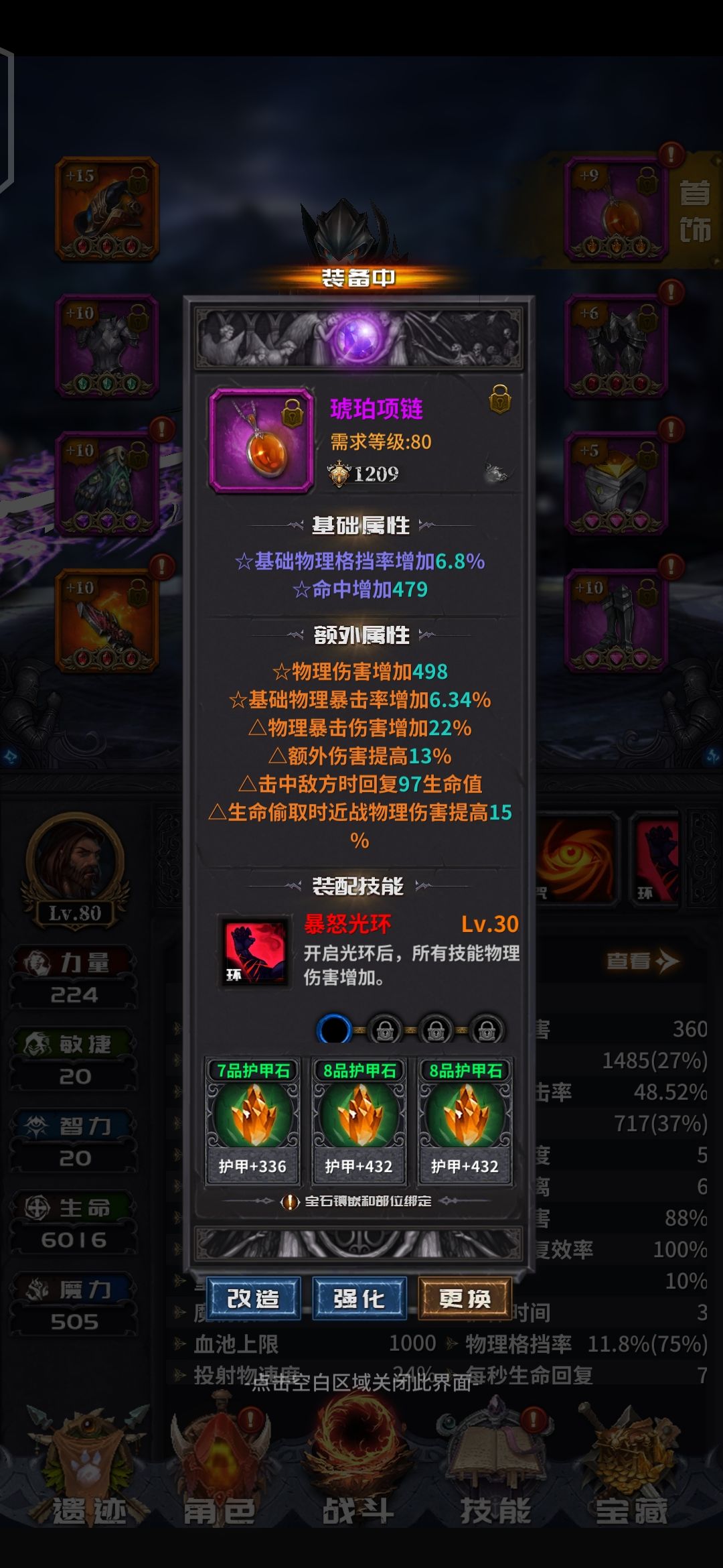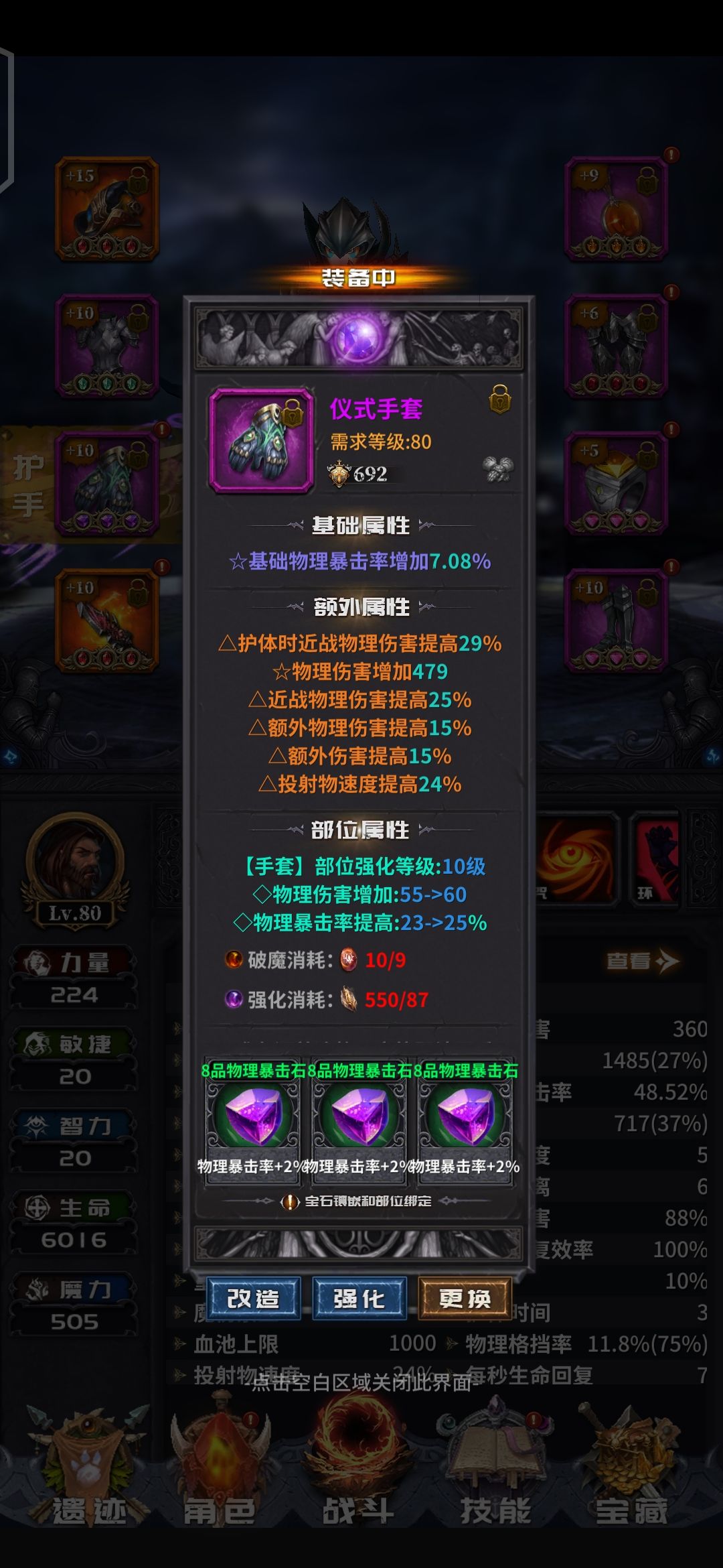 前面说过了,游戏的核心是词条。但是洗词条又是个看命的东西。所以,我们目标定为3到4条的T0增伤词条。剩下的两条看命,又要同时保证要有一条击中回血,一条击中回蓝。话不多说,直接上图。肝了两天材料洗的成果。