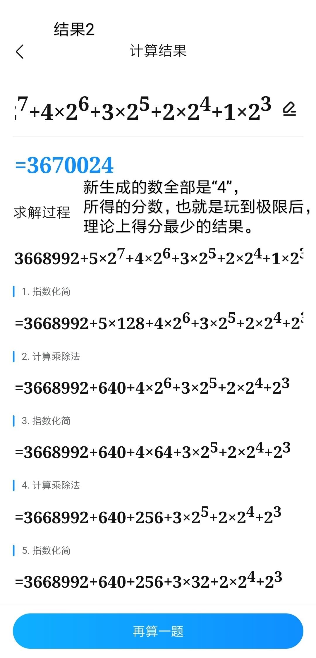 从计算结果上来看,如果把2048玩到极限,那么它的得分应该是在[3668992,3932100]这个区间内,图例1也符合这个结果。
